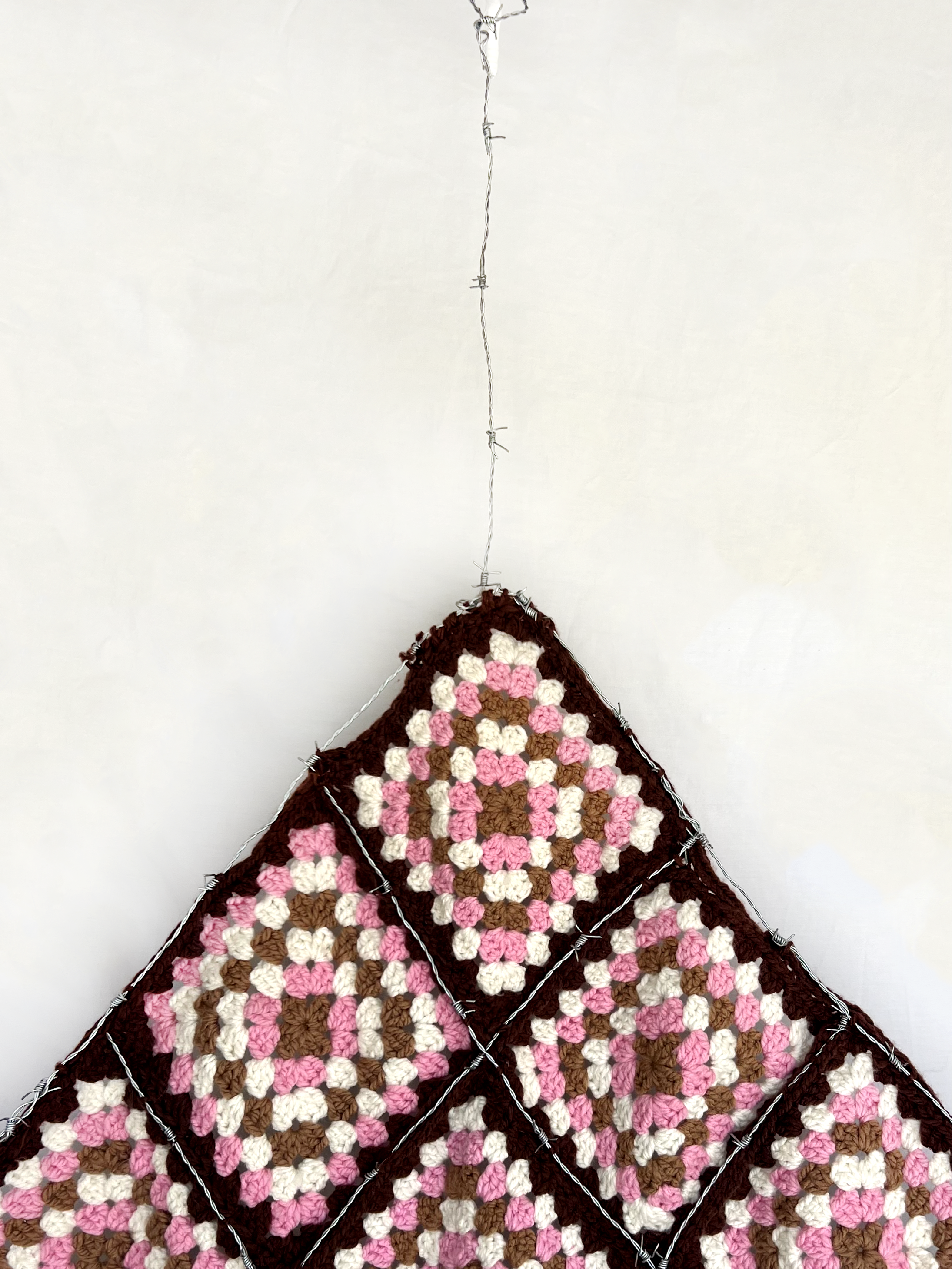 Aunt Helen’s Armor, 2025, crochet and barbed wire, 4.5’ x 3’